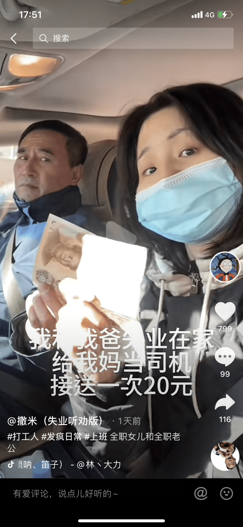 父女二人给妈妈当司机,日薪20。图/当事人撒米(失业听劝版)短视频截图