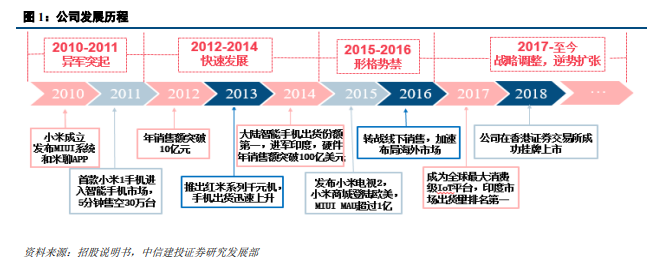 中信建投研究报告显示,早在2010年,雷军创立小米,并推出首个首个内测版miui系统和米聊android内测版,2011年发布小米手机1。在2011-2014年,小米以高性价比为核心竞争力,在2014年打败三星成为大陆智能手机出货份额第一品牌。2013年,小米推出大量生态链产品,成为全球范围里最早系统布局智能家居的企业之一。此后,小米在2015-2016年市场份额有所下滑,但在2017年战略调整后逆势扩张,成为全球最大消费级iot平台。