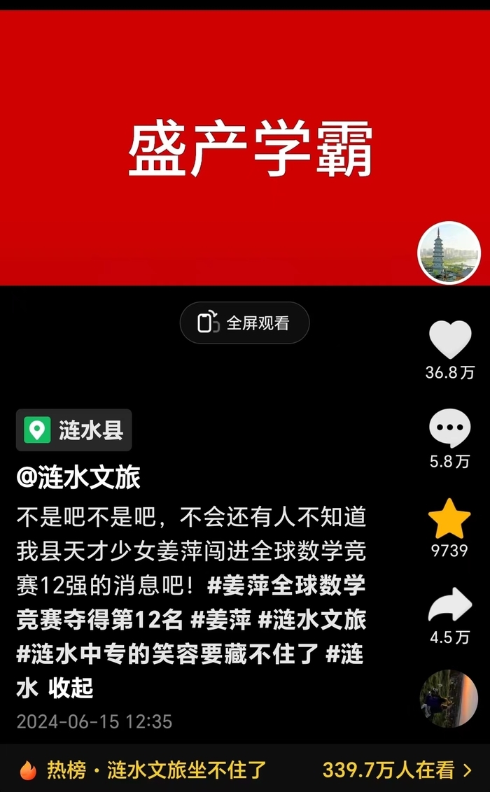 姜萍的新闻6月13日发布后,淮安文旅14日就率先发布视频祝贺姜萍:“淮安不大,创造神话,一起来看这位数学天才的家乡。”视频中,还展示了淮安市的景区景点,包括周恩来故居、妙通塔、五环湖公园、吴承恩故居等。15日,涟水文旅接着连续发布视频和文字:“涟水不大,盛产学霸。不会还有人不知道我县天才少女姜萍闯进全球数学竞赛12强的消息吧!”接着,视频中还展示了当地特色文旅:“涟水有五岛湖旅游区、金鸡坨景区、苏北小延安等,还有机场。各种美食,如涟水鸡糕、高沟捆蹄等,我们也是矿泉水之乡。涟水不大,盛产学霸!”