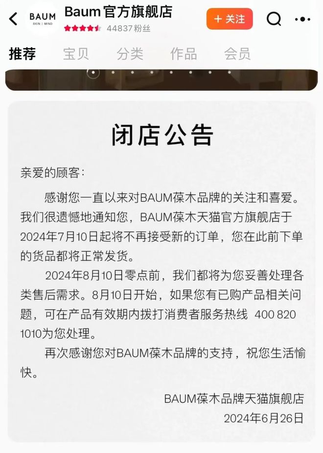 近日,BAUM葆木在天猫旗舰店发布了闭店公告,称7月10日起将不再接受新订单。与此同时,BAUM微信商城也已停业。该品牌位于上海静安芮欧百货店的首家专柜亦显示关店停业。据报道,资生堂集团证实,BAUM葆木品牌因战略调整,决定停止在中国市场的产品销售。