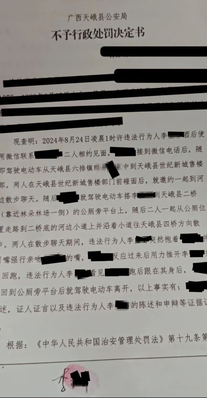 该网友发布了一份天峨县公安局的不予行政处罚决定书,上面载明,现查明2024年8月24日凌晨1时许违法行为人李某某酒后使用微信联系某某,二人相约见面。某某接到微信电话后,随即驾驶电动车从家中到天峨县世纪新城售楼部门前碰面后,就邀约一起到河边散步聊天……二人一起从公厕位置走路到二桥底的河边小道上,并沿着小道往天峨县四桥方向散步。两人在散步聊天期间,违法行为人李某某突然抱着某某,并用嘴强行亲吻某某的嘴,某某反应过来后用力推开李某某并往回跑,违法行为人李某某看见某某跑后跟在其身后,某某回到公厕旁平台后就驾驶电动车离开。