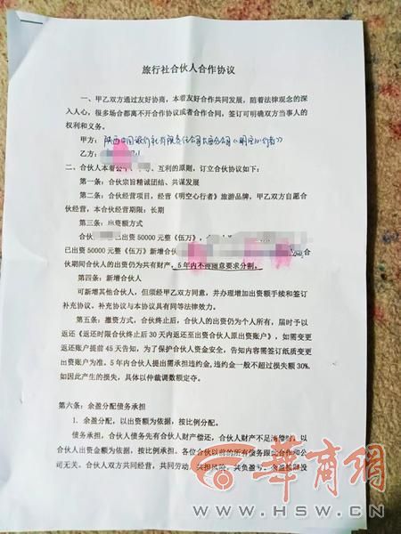 华商报大风新闻记者看到,该协议上说,甲方为陕西中旅长安分公司《明空心行者》,乙方赵先生,合伙人陈女士、冯女士已各出资5万元,新增合伙人赵先生已出资3万元整,合伙期间出资为共有财产,5年内不得随意要求分割。余盈分配以出资额为依据,合伙人共担风险共负盈亏。协议上的章子为陕西中旅长安分公司业务章。