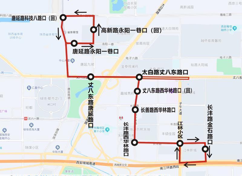 线路设置站点10个:长沣路金石路口、江林小区、长沣路西华林路口、长善路西华林路口、丈八东路西华林路口(回)、太白路丈八东路口、丈八东路唐延路口、唐延路科技八路口(回)、高新路永阳一巷口(回)、唐延路永阳一巷口。