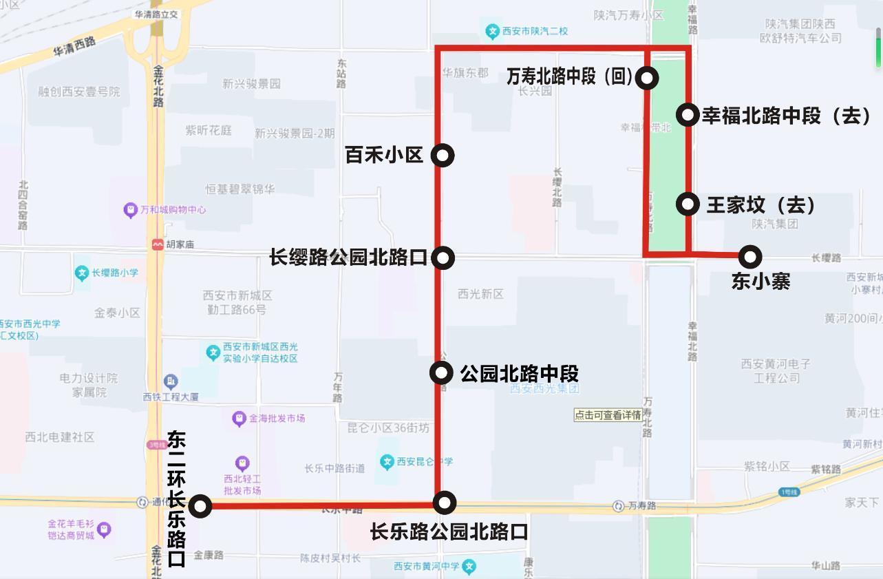 线路设置站点9个:东小寨、王家坟(去)、幸福北路中段(去)、万寿北路中段(回)、百禾小区、长缨路公园北路口、公园北路中段、长乐路公园北路口、东二环长乐路口。