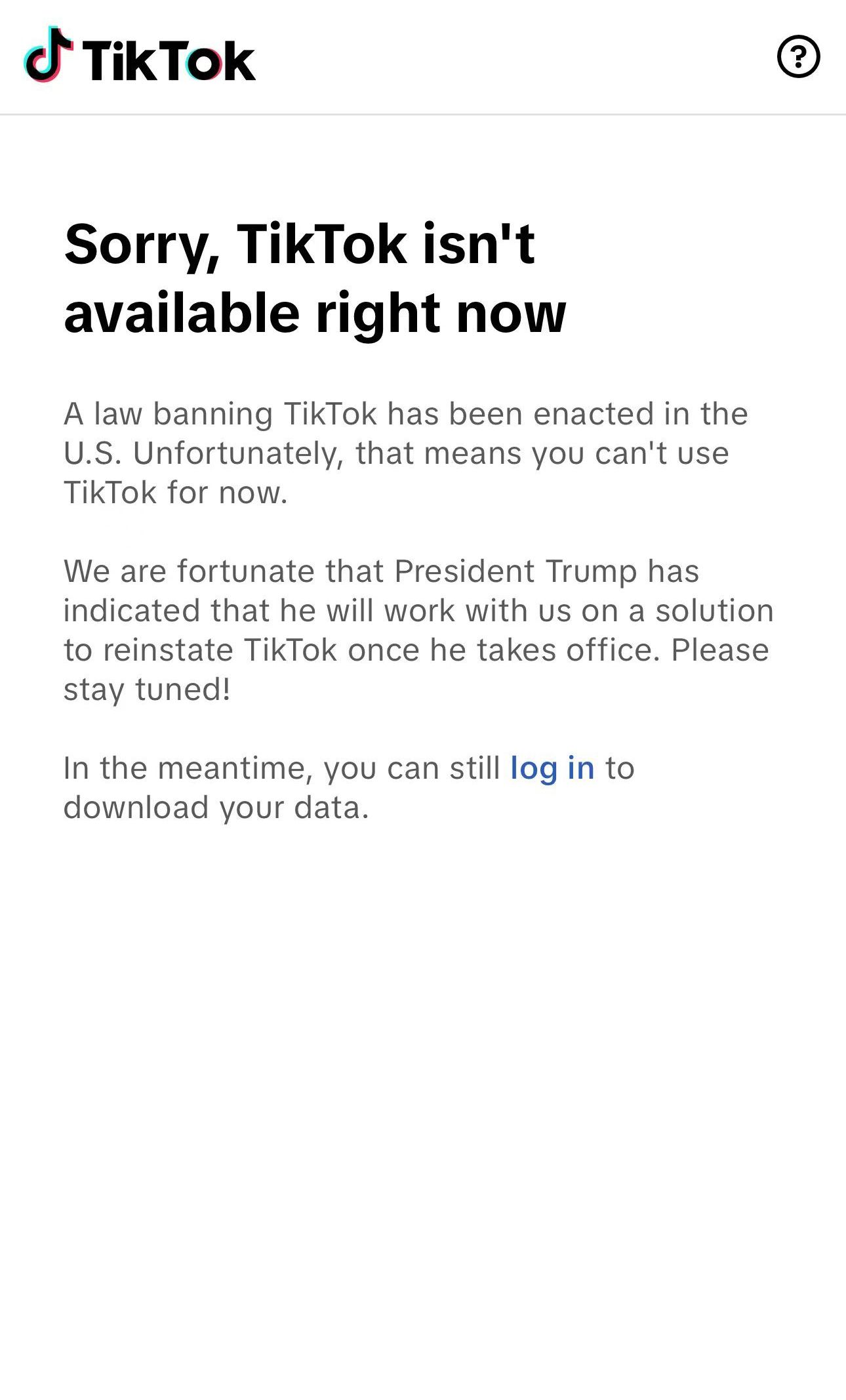 TikTok对美国用户发布的最新通知显示:美国已颁布禁止TikTok的法律,这意味着您暂时无法使用TikTok。候任总统特朗普已表示,他上任后将与我们一起研究恢复TikTok的解决方案。请继续关注。