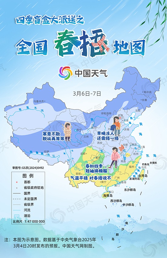 中国天气网讯 昨日短袖过夏天,今日棉袄战寒冬。3月伊始,一场寒潮打破了我国大部偏暖的天气格局,特别是刚入春的江南,多地已重现冬日般的湿冷。目前寒潮影响已结束,明后天(3月6日至7日)北方天气晴朗,升温步伐加快,但南方大部在阴雨影响下回温乏力,湿冷持续。中国天气网推出全国春捂地图,看哪里春如四季还需捂一捂。