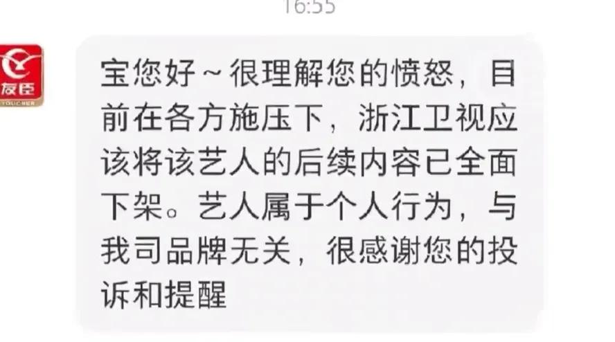 节目赞助商之一友臣回应称:“很理解您的愤怒,目前在各方施压下卫视应该将该艺人的后续内容已全面下架,艺人属于个人行为,与我司品牌无关。”