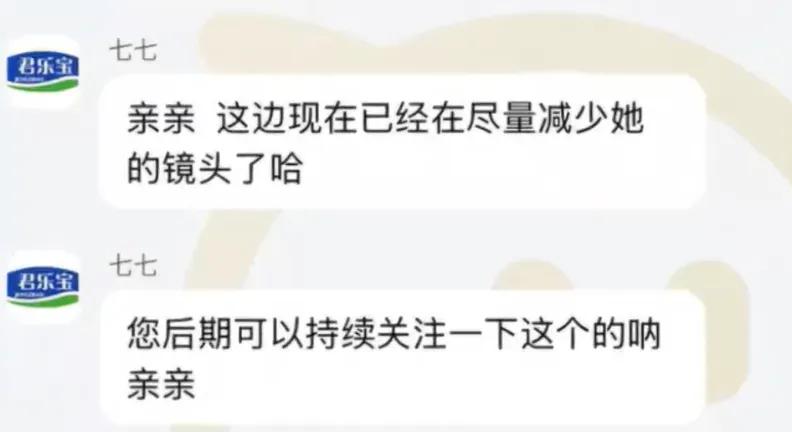 君乐宝客服表示:“这个相关部门还未给我们答复,这边已经在尽量减少她(麦琳)的镜头了。”