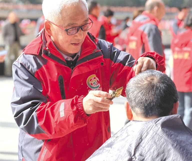 志愿者王定青为社区居民义务理发(资料照片)。 受访者供图