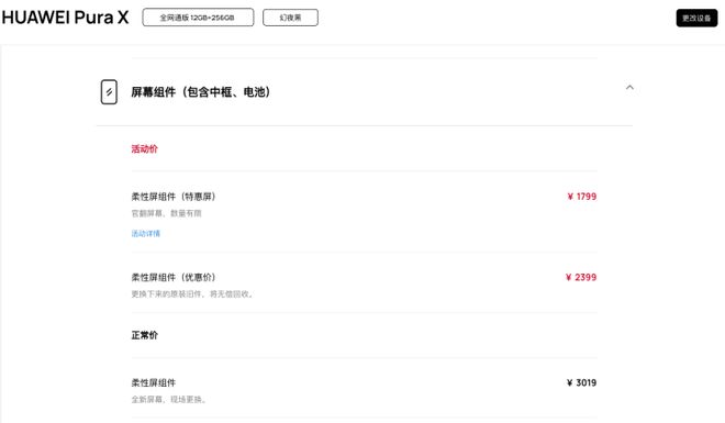 发布会结束后,华为官方披露了华为Pura X的维修配件价格,该产品外屏主体正常价为699元,柔性屏主体活动价为1299元,柔性屏组件正常价为3019元,柔性屏组件优惠价为2399元,柔性屏组件特惠屏价为1799元,主板正常价为3299元、活动价为2339元,电池价为199元。