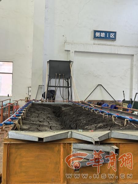 在工作人员的专业操作下,“天降大雨”,“雨水”落在液压变坡实验槽上,这个实验槽是一个自上而下的斜坡造型,左侧是黄土高原沟沟壑壑的地形,右侧是植被茂盛的“黄土高原”,两侧的最下方各有一个出水口。当“雨水”落下,左侧流出的水明显浑浊,且量大;右侧流出的水更清澈,水量少。方怒放介绍:“右侧的植被是真实栽培的,左侧的水浑浊,就是因为雨水带着泥沙流走了,通过这个实验槽,能直观地说明,黄土裸露时,更易发生水土流失;土壤植被茂盛时,水土不易流失。”