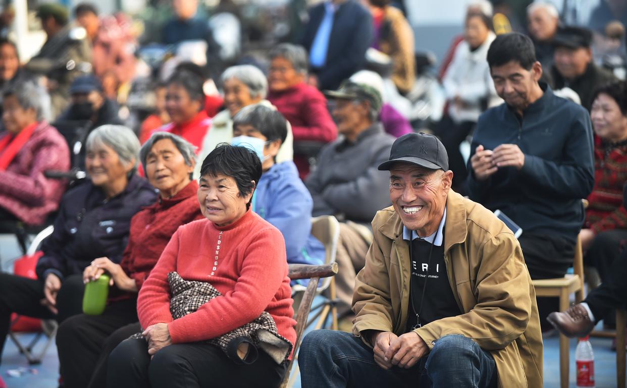 10月26日,老人们在河南省洛阳市涧西区工农街道大所社区文化广场举行的重阳节公益演出活动上欣赏豫剧节目。新华社发(黄政伟摄)