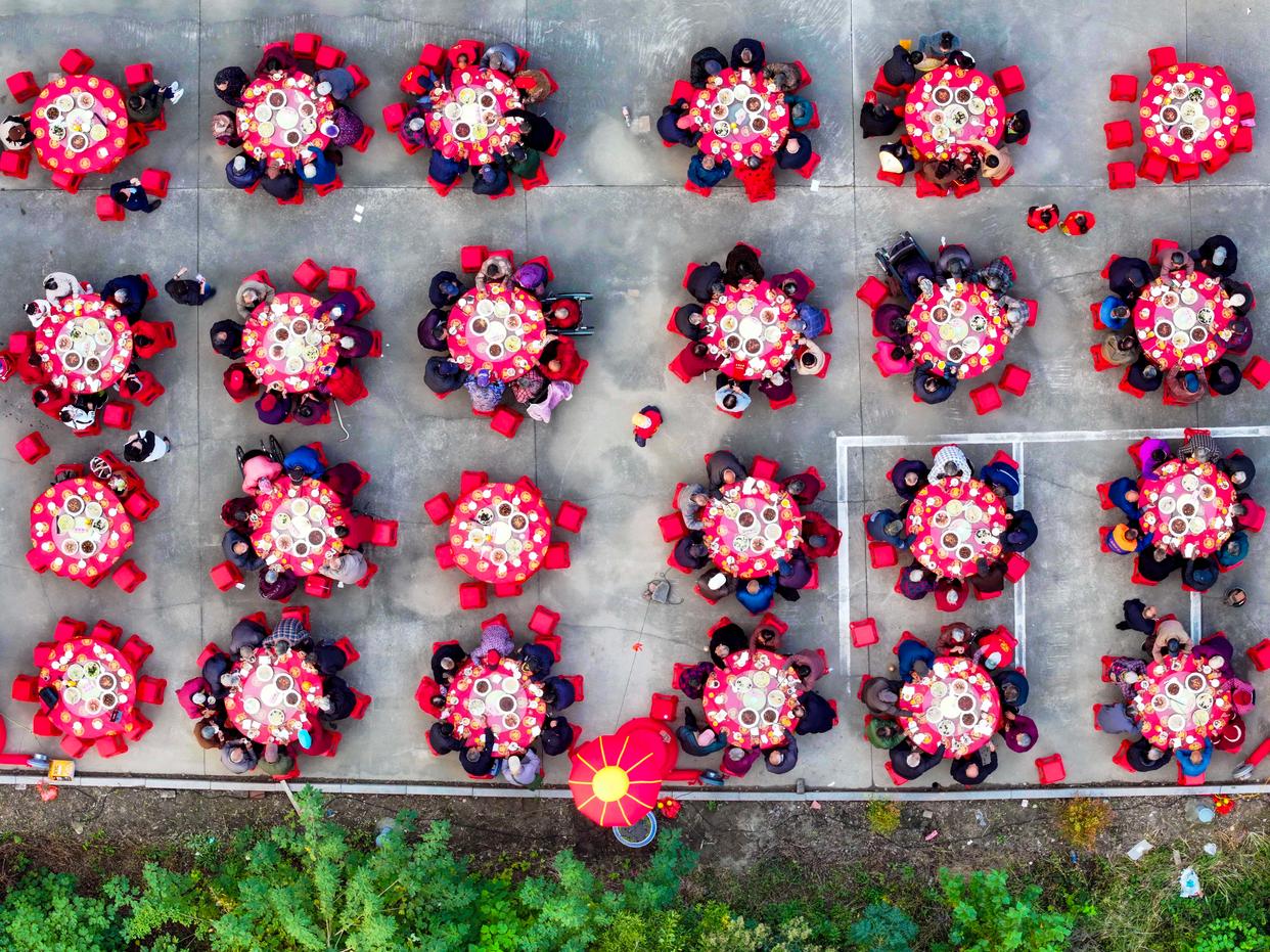 10月26日拍摄的江苏省泰州市姜堰区白米镇马沟村第三届重阳节“百寿宴”现场(无人机照片)。新华社发(顾继红摄)