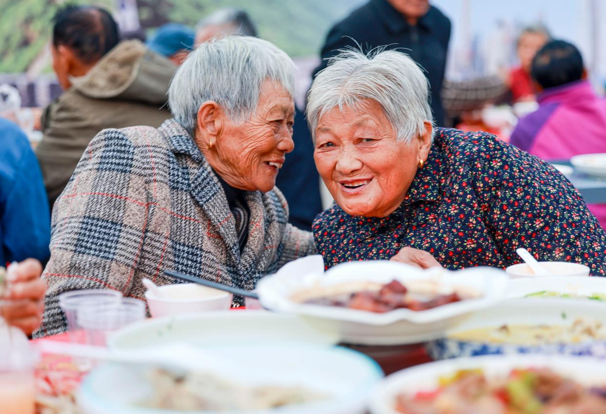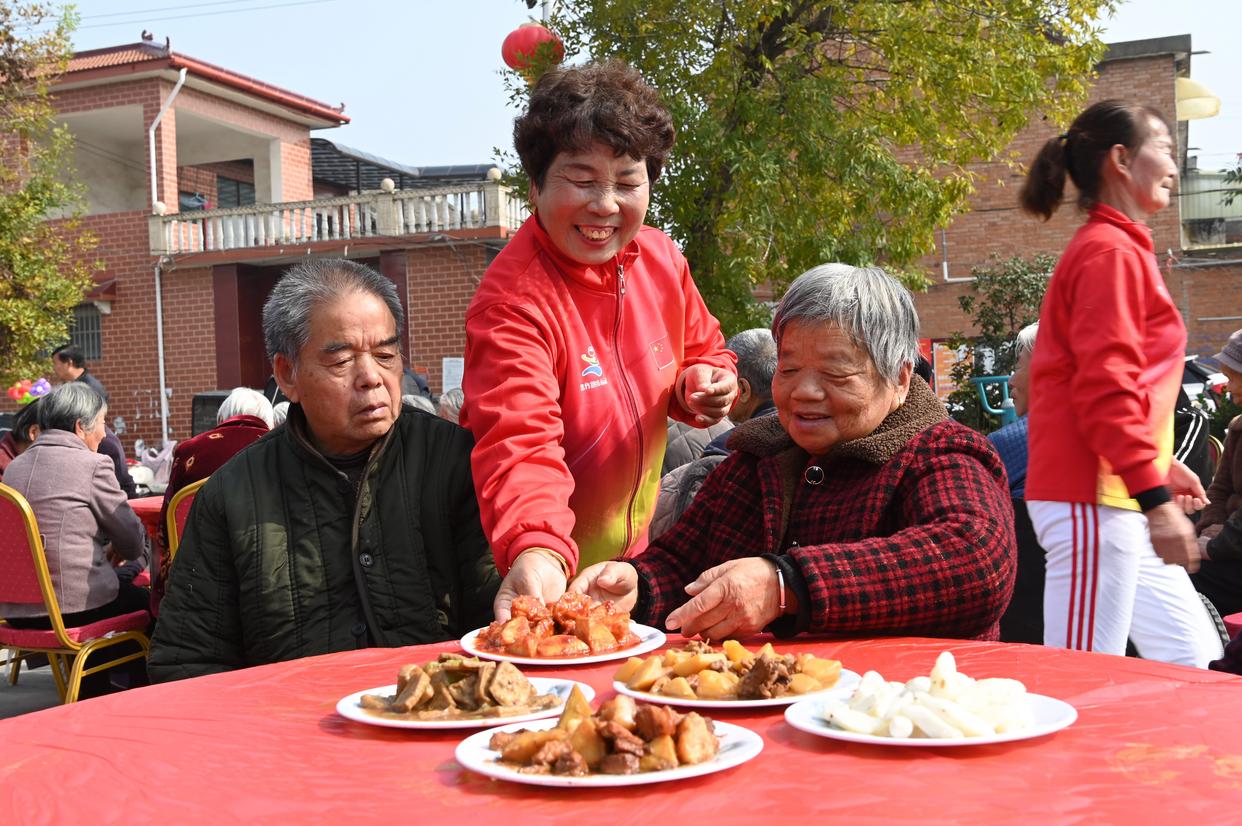 10月27日,在河南省沁阳市西万镇留庄村举办的“九九重阳节,浓浓敬老情”迎重阳主题活动中,志愿者为老人摆上“长寿宴”菜品。 新华社发(杨帆摄)