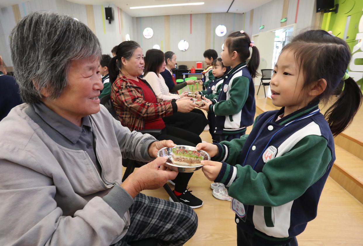 10月27日,在江苏省苏州市姑苏区平润实验幼儿园,小朋友为长辈送上重阳糕。新华社发(杭兴微摄)
