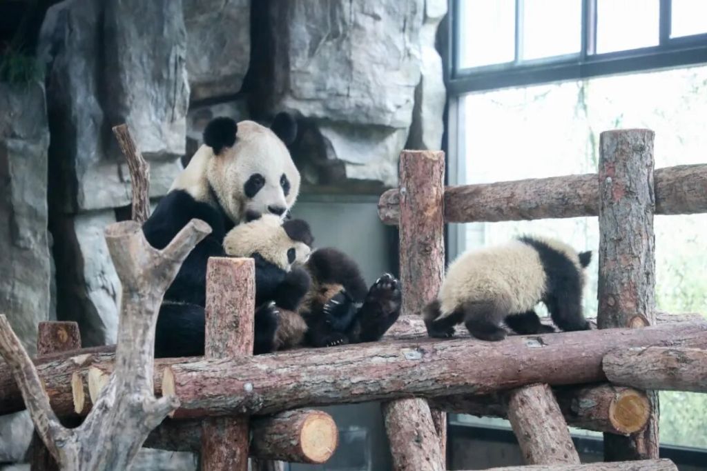 保育员补充道,“芊金”顺利诞下龙凤胎后,考虑到同时哺育双崽可能面临的风险,保育团队果断采用“母带幼为主、人工辅助为辅”模式,24小时轮班监测,强化营养补充,确保“芊金”与幼崽健康。经过170余天的精心呵护后,“芊然”“芊逸”均由“芊金”妈妈哺育。