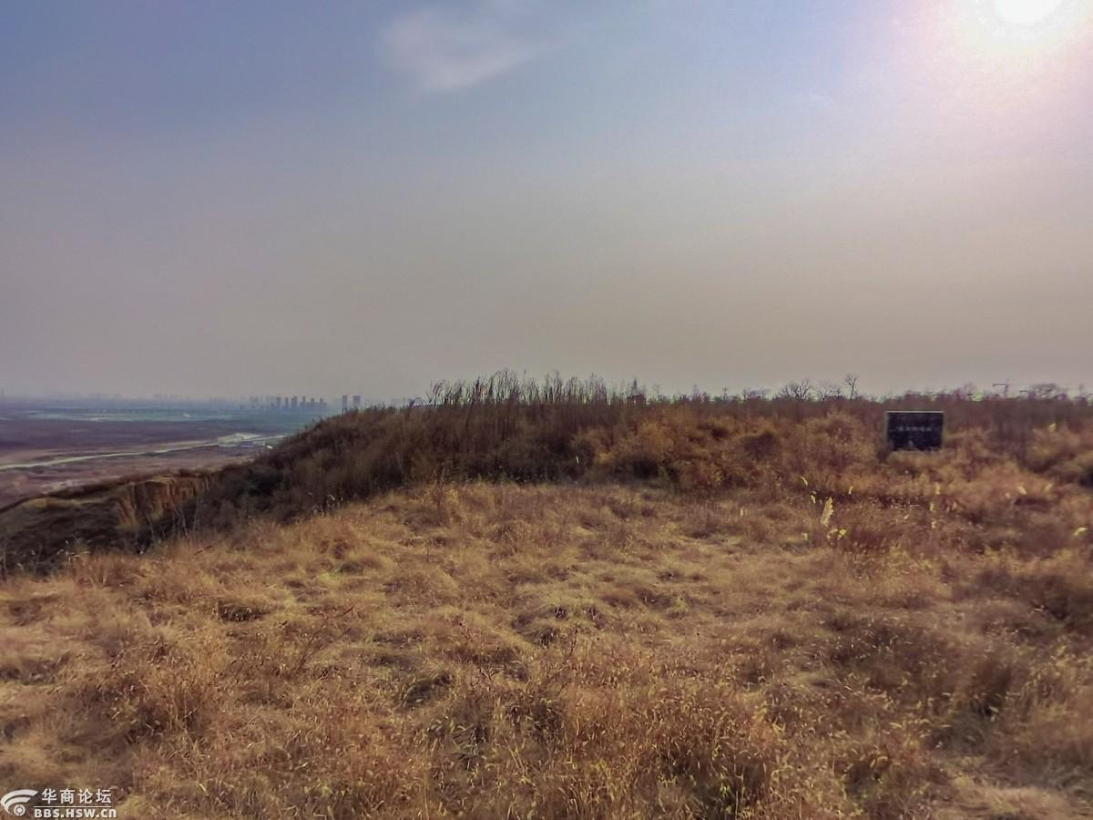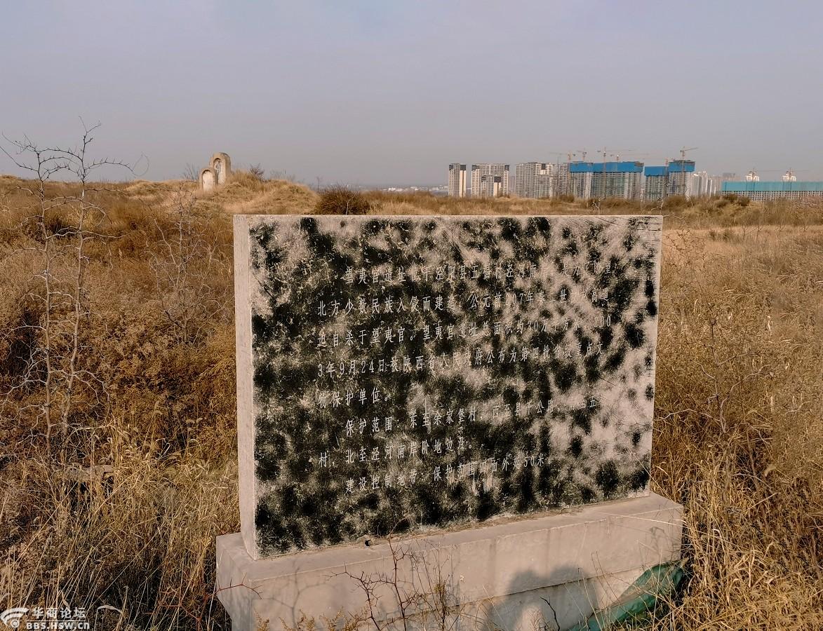 但周围已经不是原来的地面,明显是取土后的地面,石碑离泾河岸仅几米远,这里地势险要,居高临下,向北望去,泾阳县清晰可见,远处北仲山与嵯峨山隐隐约。这时正好秦汉新城文物部门的工作人员来了,工作人员告诉我们,前些年文物保护意识不强,这里曾经是砖瓦厂,生产取土破坏了文物;现在对文物重视了,现在正在对遗址保护进行施工,目前第一步是先绿化,整治美化环境,我们看到的施工现场就是对遗址绿化进行施工的。在工作人员的指引下,我们还找到了前些年立的文物保护碑。